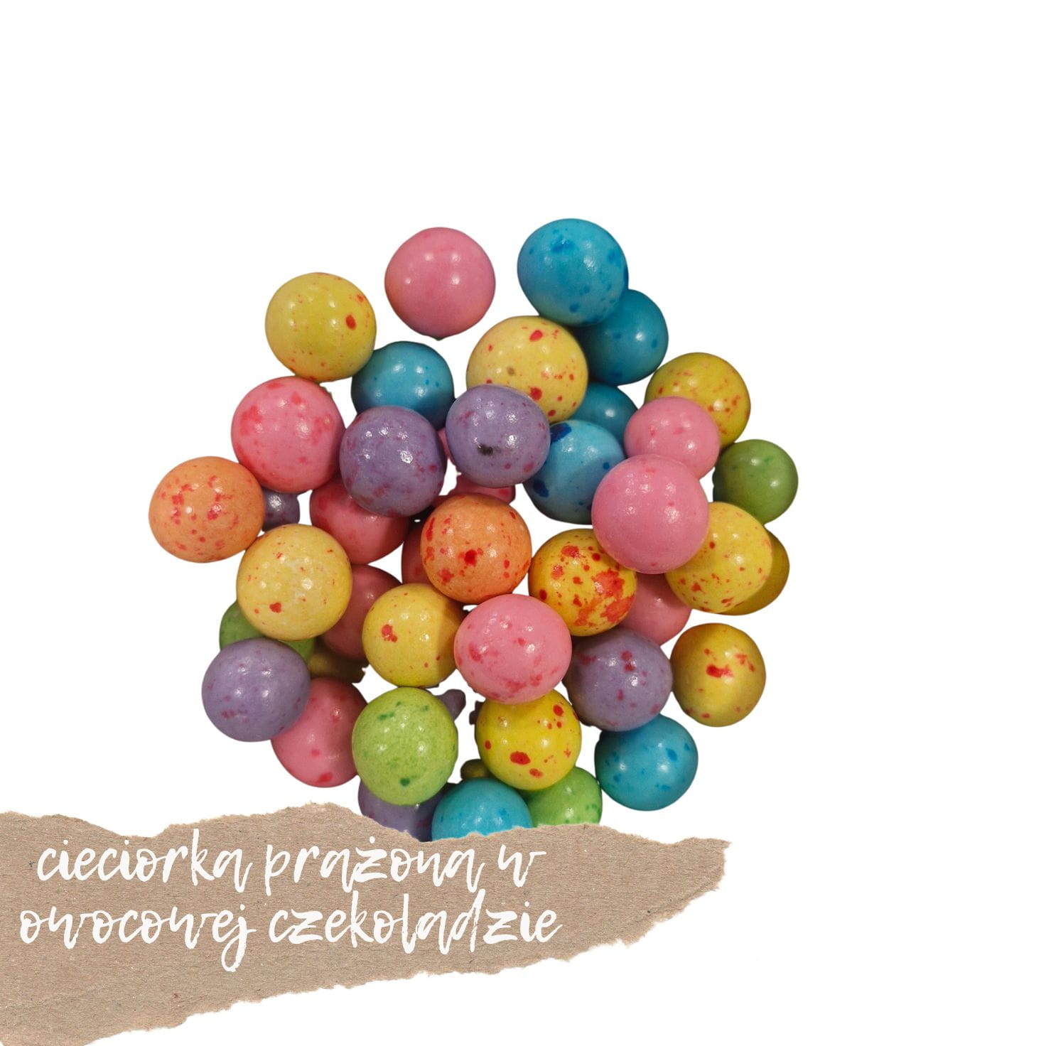 Składniki: prażona ciecierzyca (36%), czekolada (36%) (cukier, masło kakaowe, mleko w proszku, masa kakaowa, emulgator (E322), polewa cukrowa (28%) (cukier, stabilizator (E414), barwnik (E100, E127, E133), substancja glazurująca (E903). Barwniki mogą mieć szkodliwy wpływ na aktywność i skupienie uwagi u dzieci.