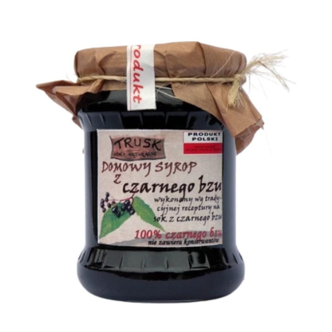 Domowy syrop z czarnego bzu marki TRUSK Soki Naturalne–wykonany według tradycyjnej receptury na sok z czarnego bzu.