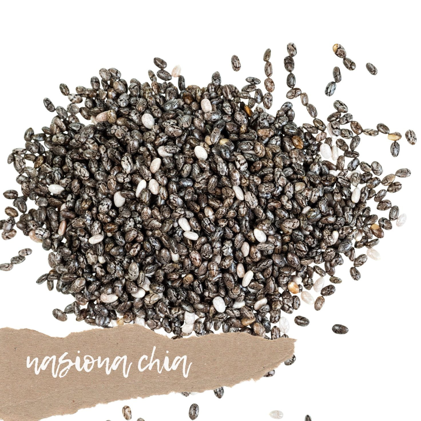 Nasiona chia to drobne, owalne nasiona pochodzące z rośliny Salvia hispanica, uprawianej głównie w Ameryce Południowej i Środkowej. Mają szaroczarny kolor i neutralny smak, dzięki czemu łatwo wkomponowują się w różne potrawy. Są cenione za wysoką zawartość błonnika, kwasów tłuszczowych omega-3, białka roślinnego oraz minerałów takich jak wapń, magnez i żelazo. Po zalaniu wodą lub mlekiem tworzą żelową konsystencję, co sprawia, że doskonale nadają się do przygotowywania puddingów, jogurtów, smoothie i wypieków. Nasiona chia są naturalnie bezglutenowe i chętnie wykorzystywane w dietach wegańskich i prozdrowotnych.
