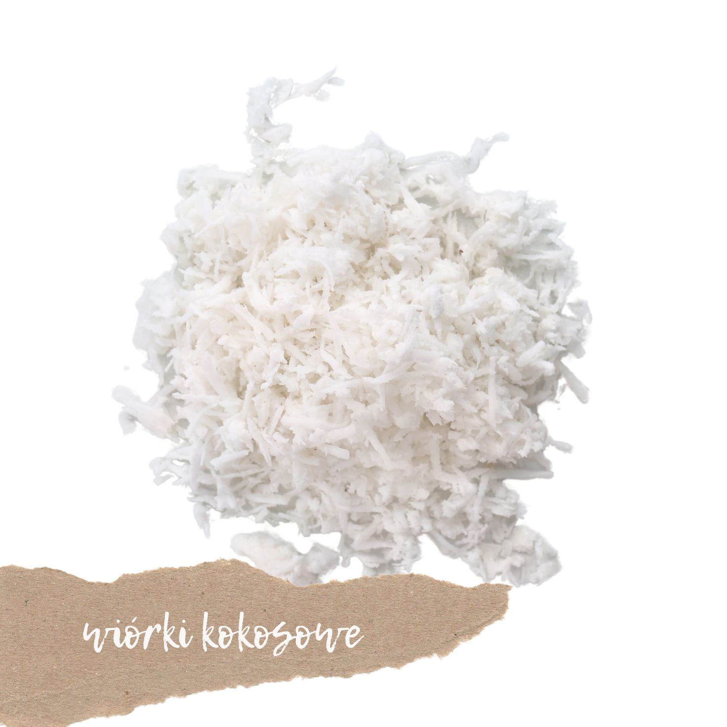 Wiórki kokosowe to drobno starte, wysuszone kawałki miąższu kokosa. Mają charakterystyczny, słodkawy smak i intensywny kokosowy aromat. Są popularnym dodatkiem do ciast, deserów, musli oraz potraw kuchni azjatyckiej. Dzięki wysokiej zawartości błonnika wspomagają trawienie. Zawierają również zdrowe tłuszcze nasycone i niewielkie ilości minerałów, takich jak żelazo i magnez.